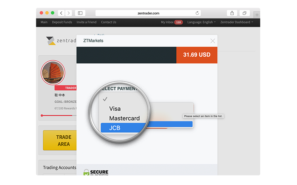 Visa、Mastercard、またはJCBを利用して、ゼントレーダー口座へ即時入金できます。クレジットカード入金はスピードと利便性を重視した設計で、安全な認証決済により、取引残高へすぐにアクセスできます。