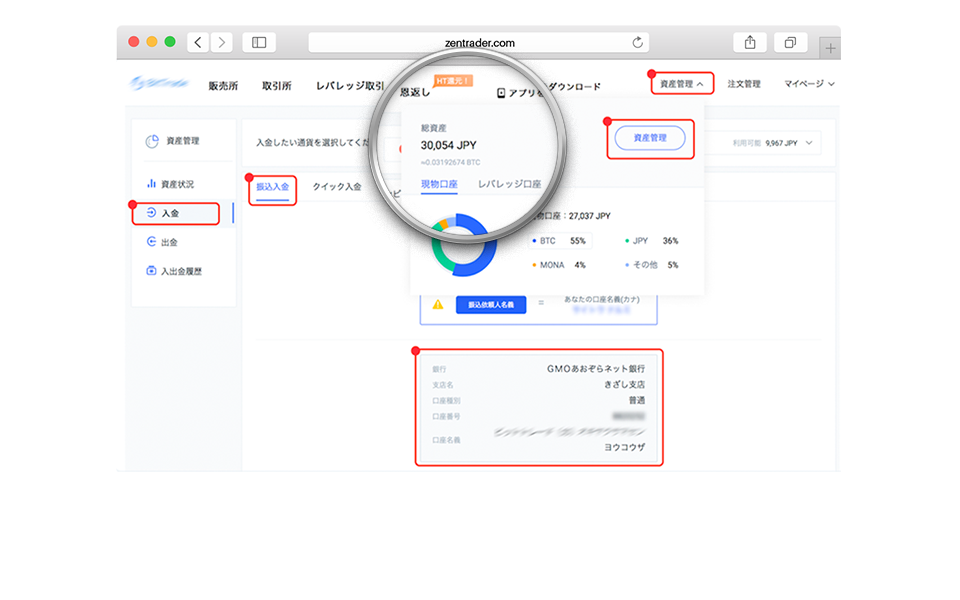 口座内で入金リクエストを作成し、指定された参照番号を使用して正確な金額をお振込みください。