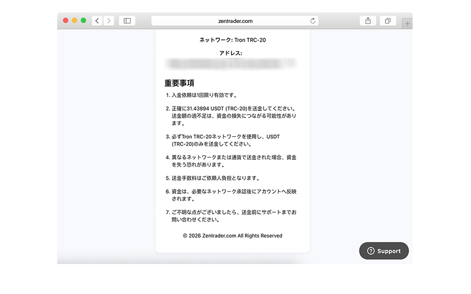 わかりやすい手順、リアルタイムの日本円換算、オンチェーン承認で、主要な暗号資産を使ってゼントレーダー口座に入金できます。柔軟性、グローバルなアクセス、資金の完全なコントロールを重視するトレーダーのために設計されています。
