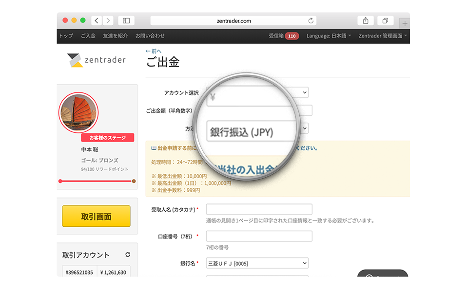 ゼン・トレーダーでは、本人確認済みの銀行口座へのみ出金を行います。