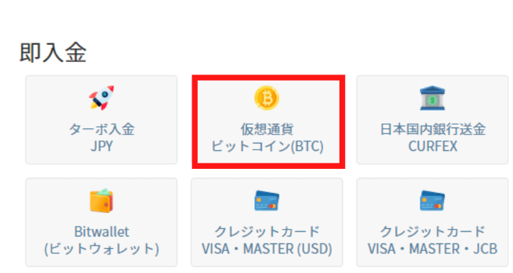 1. ゼン・トレーダー管理画面の入金ページから「仮想通貨 ビットコイン入金」を選択します。